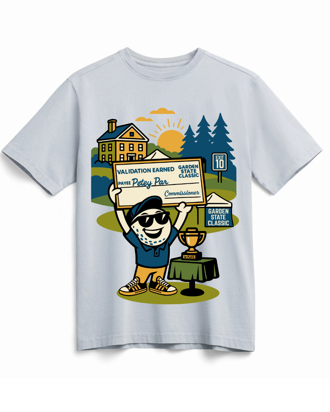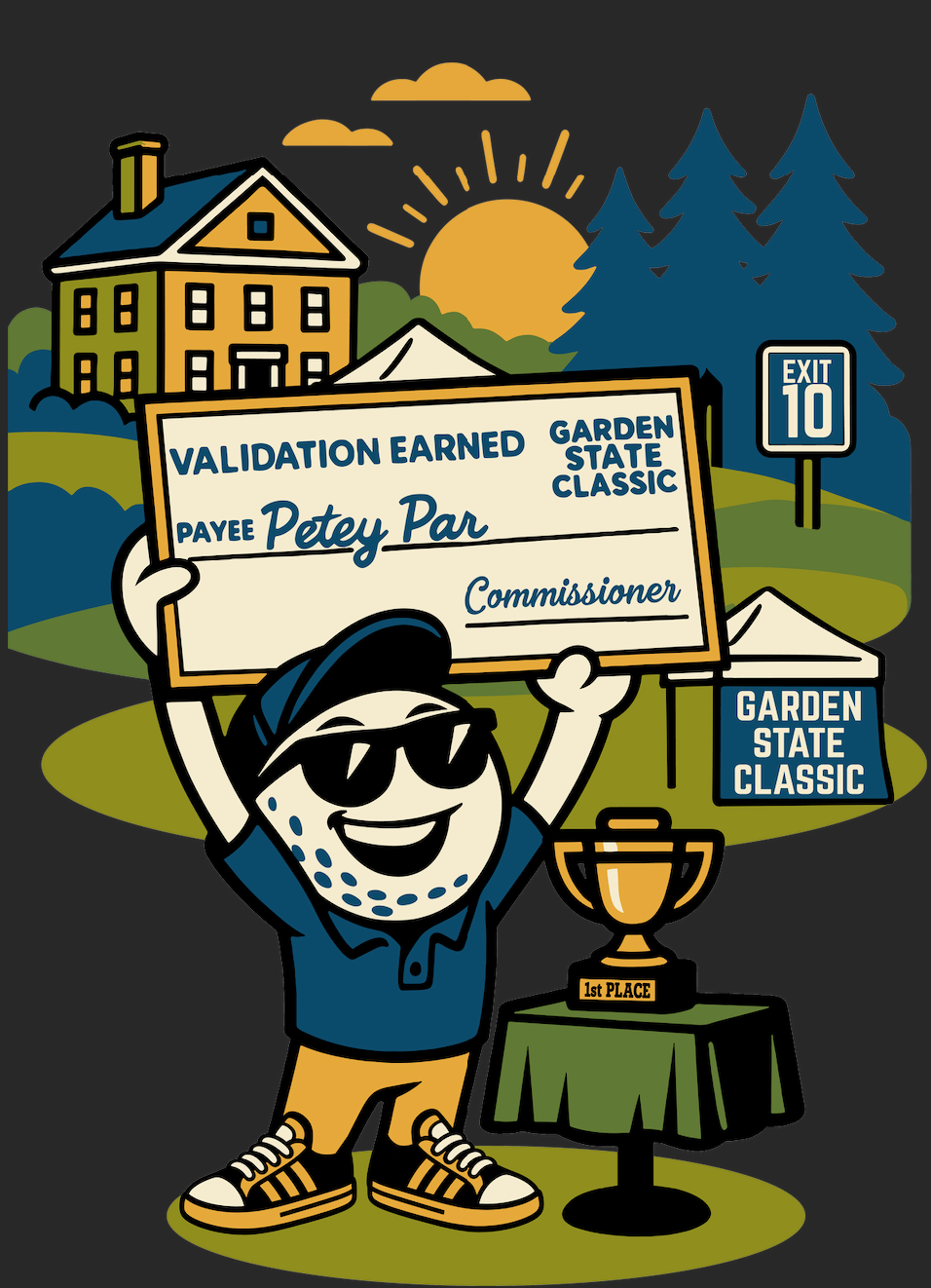 The Story Behind the Design: The "First Check" represents more than just a win – it's about that first taste of victory that changes everything. Set against the backdrop of New Jersey's challenging courses, this design captures Petey Par's triumphant moment, complete with his signature sunglasses and street-style swagger, now holding that golden trophy he's been chasing.